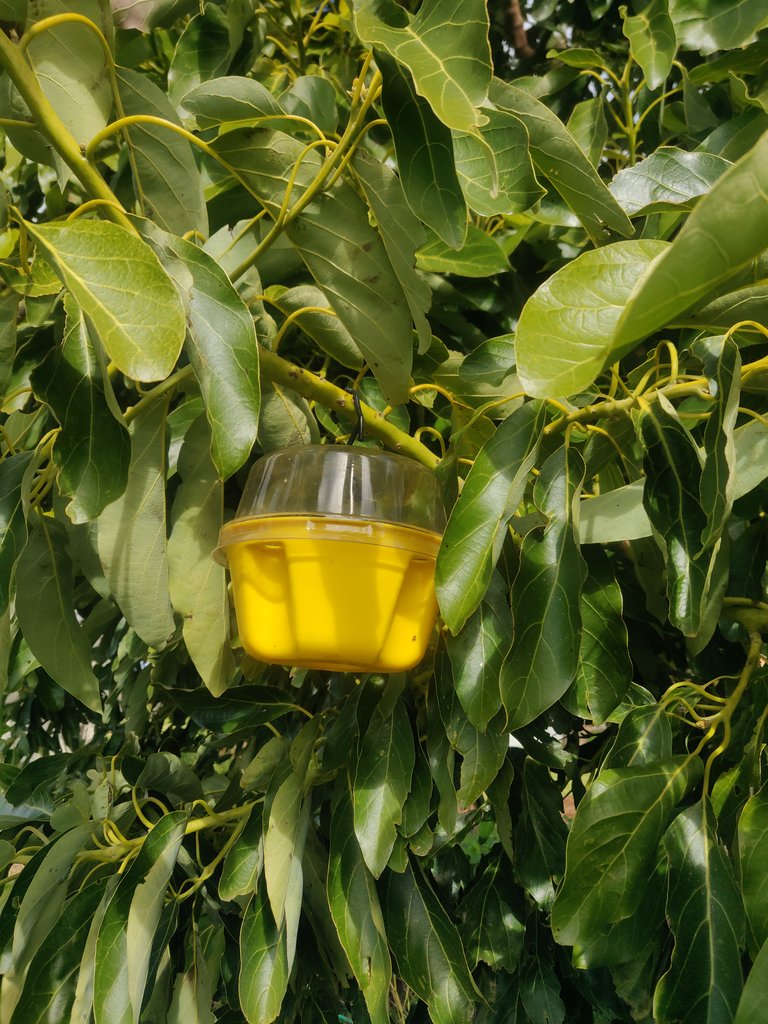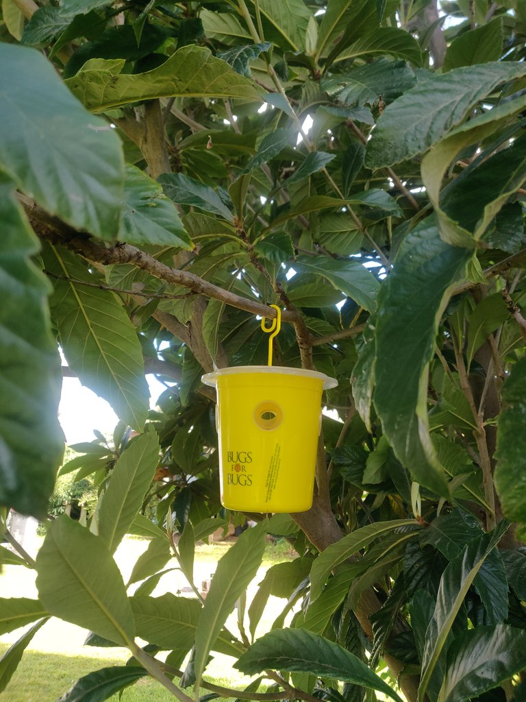 Traps should be hung in trees just underneath the foliage on the north eastern side of the tree, to catch the morning sun. During winter, it’s important that traps are sited in evergreen trees, because fruitfly are still active but shelter in leafy trees. Citrus, Loquat, Avocado and other evergreen fruit trees are ideal, but any evergreen will do. During the remainder of the year while fruit trees are in leaf, placement of traps into trees several weeks prior to fruit ripening is ideal. Any location is better than none at all!