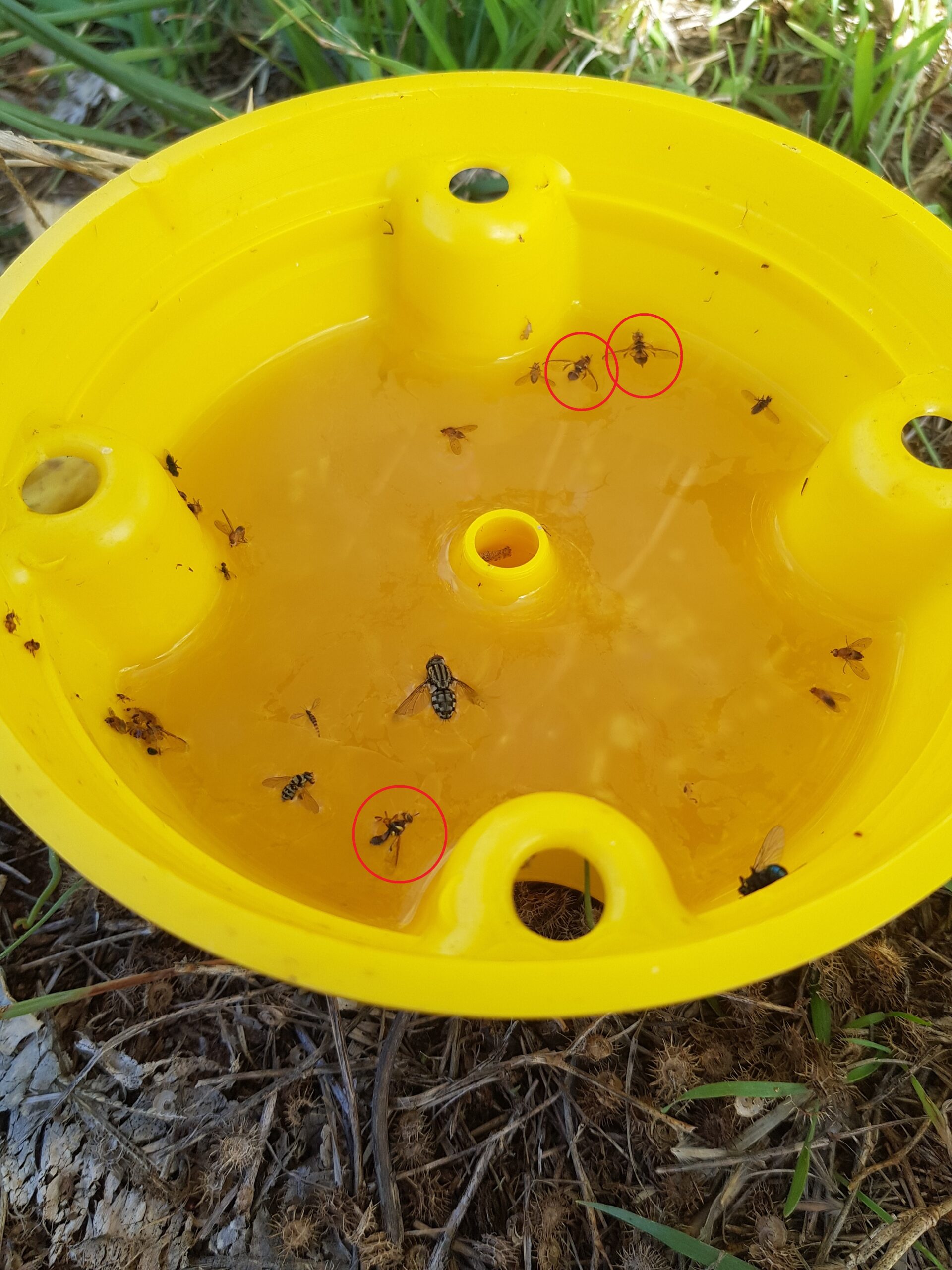 Currently, we are using two types of trap. Both work on the principle of emitting pheremones, or scents, that attract either female fruitfly or male fruitfly.