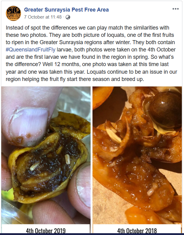 Below is a snapshot from the Greater Sunraysia Pest Free Area Facebook page showing that QFF maggots have already been found in loquats (last Friday).